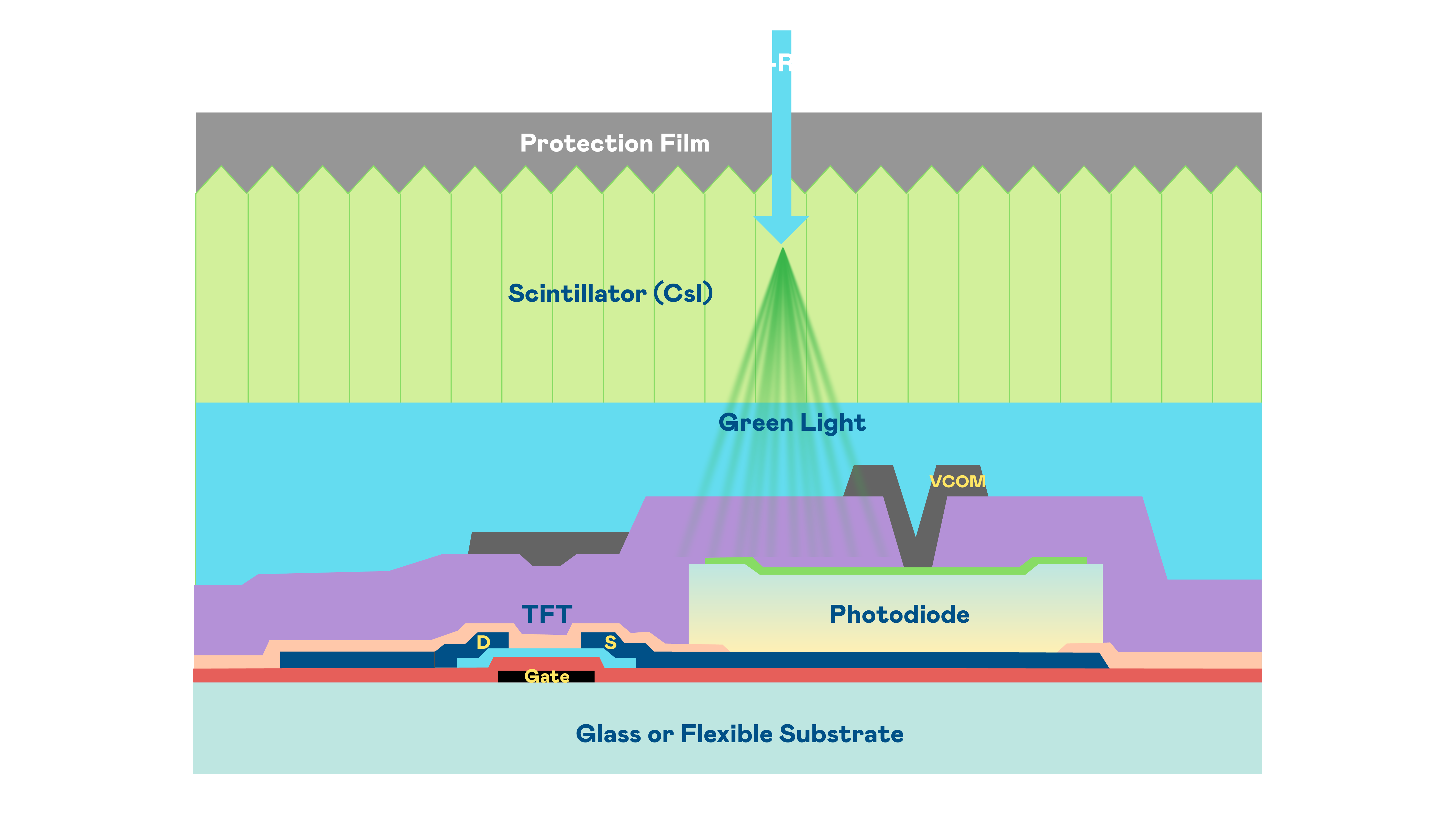 伟德国际1949的X光影像感测阵列使用薄膜电晶体 (TFT) 作为每个像素的读取开关,搭配光电二极体(Photodiode)的光电转换元件,用以感测X光影像讯号。